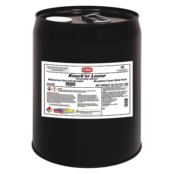 Penetrating Lubricant, CRC, Knock'er Loose, Net Fill 5 gal, Container Size 5 gal, Pail, Mineral Oil, Min. Operating Temp. 32 Degrees F, Max. Operating Temp. 300 Degrees F, H2 No Food Contact NSF Rating, Yes 50 State VOC Compliant, 24 Percent VOC Content, Red, Odorless No, Flammable, Combustible Liquid (Category 4), Flash Point 147 Degrees F, RoHS, NSF Registration #132080, USDA Certified Biobased Product No