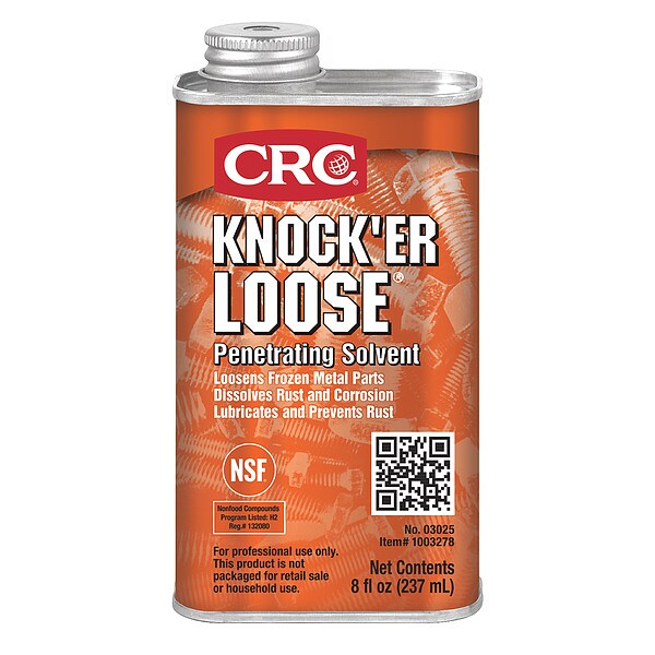 Penetrating Lubricant, CRC, Knock'er Loose, Net Fill 8 oz, Container Size 8 oz, Can, Mineral Oil, Min. Operating Temp. 32 Degrees F, Max. Operating Temp. 300 Degrees F, H2 No Food Contact NSF Rating, Yes 50 State VOC Compliant, 24 Percent VOC Content, Red, Odorless No, Flammable, Combustible Liquid (Category 4), Flash Point 147 Degrees F, RoHS, NSF Registration #132080, USDA Certified Biobased Product No
