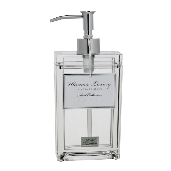 This classic clear Hotel Collection is crafted from high quality heavy acrylic. The clarity of the clear acrylic is just one of it's fine characteristics. This collection coordinates with any decor with its clear properties. This collection works well in any room of the home providing functional storage. Soap/Lotion Dispenser 3.75 x 2 x 8.5 inches H Easy care. Wipe clean with a soft damp cloth.