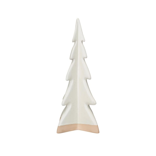 This cream decorative stoneware tree with reactive glaze is a beautiful and convenient way to decorate for the holidays. It features a decorative stoneware tree with a cream color and a reactive glaze that creates a unique pattern on each piece making it a one-of-a-kind item. The tree has a smooth and glossy texture that is pleasant to touch and look at. The tree is ideal for displaying on a table shelf or mantel where it can add a touch of sophistication and charm to any space. The tree is made of stoneware that is sturdy durable and easy to clean making it a great choice for holiday decoration. It measures 4 in. in length 4 in. in width and 11 in. in height making it a subtle and attractive centerpiece. Elevate the holiday decor with this eye-catching Christmas tree adding both style and a touch of whimsy.