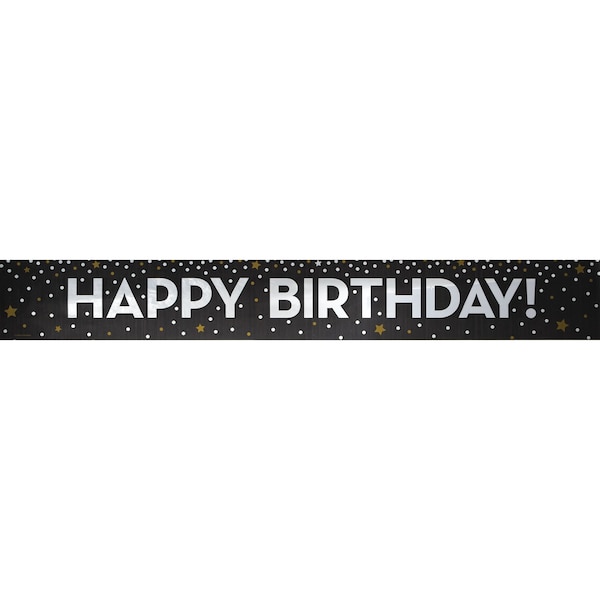 Add a glamourous touch to your birthday party with help from our Gold and Silver Happy Birthday Foil Banner! The banner measures 72" x 5", a great option for hanging above a cake or gift table. Metallic silver "HAPPY BIRTHDAY" text pops against the black background and is accented by gold stars and silver polka dots. Our Gold and Silver Happy Birthday Foil Banner is sold 12 banners per package.
