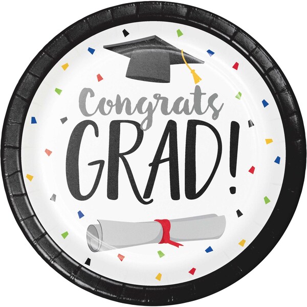 Create a festive mood for family and friends when you celebrate with the Graduation Fun Paper Plates. These sturdy paper plates measure 9" and feature mortarboard caps, confetti dots and the words "Congrats Grad!" with a black, blue, green, yellow, red, and white theme. Sold in packs of 96, these disposable paper plates coordinate with all Graduation Fun party supplies.