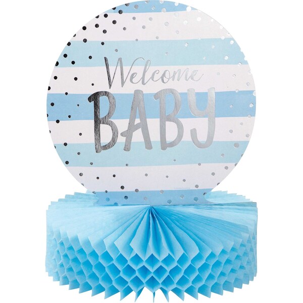Complete your party theme with this Blue and Silver Celebration Baby Shower Centerpiece. Featuring a blue and silver design with the phrase "Welcome Baby" centered in the middle, these centerpieces are the perfect addition to your celebration. Measuring 9" x 12" and sold in quantities of 6, these centerpieces can be paired with any other Blue and Silver Celebration party supplies.