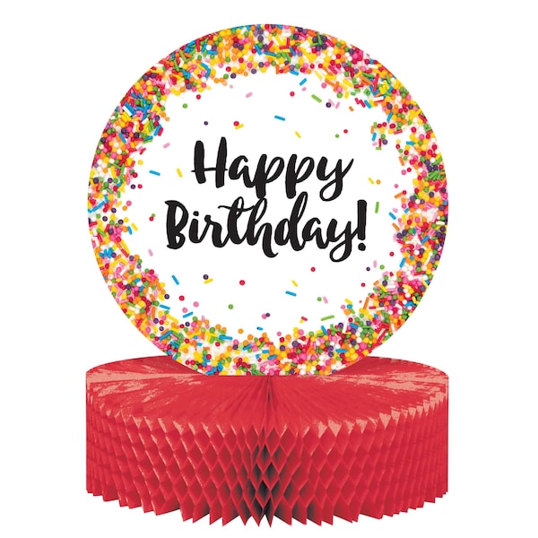 Make sure your party tables are the center of attention by adding the Confetti Sprinkles Centerpiece. This table decoration has a round honeycomb base with a festive "Happy Birthday" cutouts sitting atop. This centerpiece is sold in packs of 6 and coordinates with other Confetti Sprinkles tableware and party supplies.