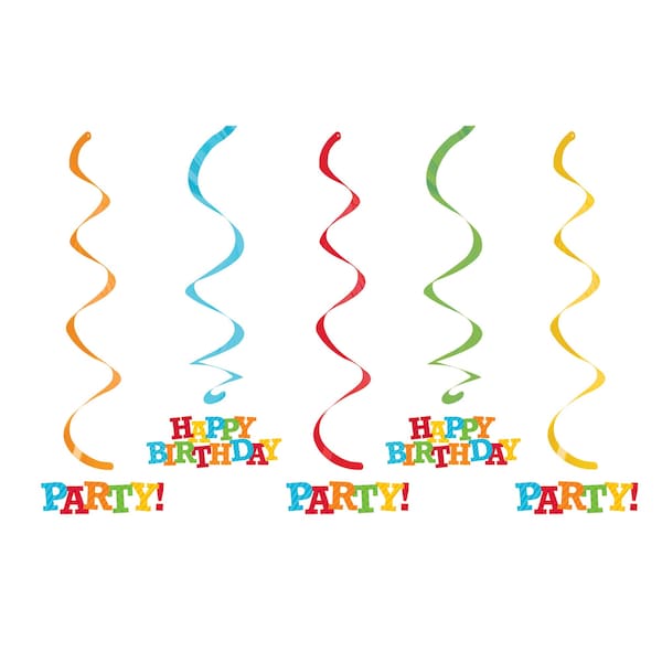 Give your guests a party to remember with the addition of these Happy Birthday Striped Dizzy Danglers. "Happy Birthday" and "Party" text hang from these multi-colored danglers making them perfect for the big day! Sold in quantities of 30, you can't go wrong when including these decorations.