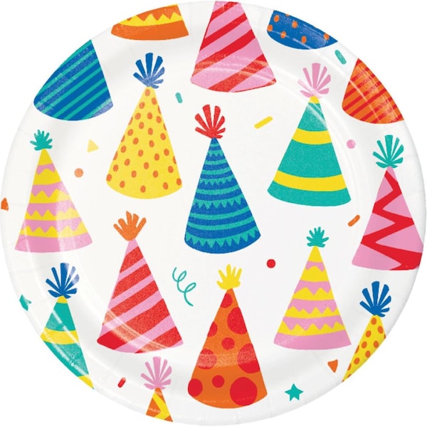 Dish up delicious treats and snacks on these Hats Off Birthday Hats Dessert Plates. Featuring a scattered party hat design in bright and vivid colors including pink, red, cobalt blue, yellow, orange, and green, these dessert plates will help create an unforgettable celebration. These party plates measure 7 and easily fit your favorite sweet treats, appetizers, and small bites including slices of cake, brownies, cookies, and pie. Made out of recyclable paper for your convenience so you can focus on the fun instead of the clean-up. Sold in packs of 96, these dessert plates can be paired with other Hats Off Birthday Party supplies to bring a unique party theme to life.