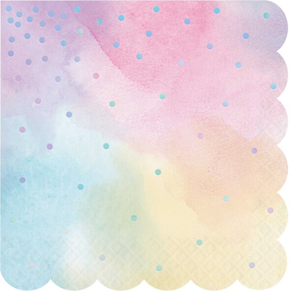 These Iridescent Party Napkins will take your party to the next level. These beautiful 6.5” party napkins display an iridescent treatment of shades of pink, purple and blue with white dots all over. Featuring a scalloped design, these napkins are sold in quantities of 192 and perfectly accentuate other Iridescent Party party supplies.