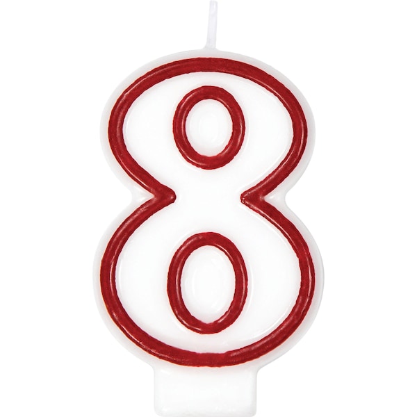 Top off your birthday celebration with the #8 Candle! This cake decoration is shaped like the number eight and allows you to create a customized birthday surprise. This product is sold in packs of 6 and is decorated with a red outline and white center.
