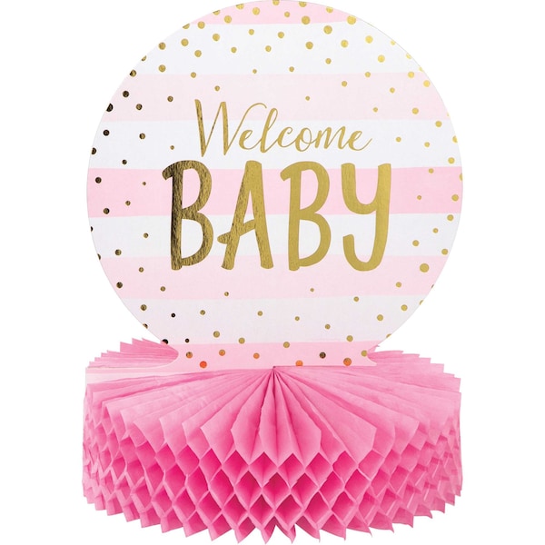 Celebrate in style with this Pink and Gold Celebration Baby Shower Centerpiece. Featuring an elegant pink and gold design with the phrase "Welcome Baby" centered in the middle, these centerpieces are the perfect thing for your party tables. Measuring 9" x 12" and sold in quantities of 6, these centerpieces can be paired with any other Pink and Gold Celebration party supplies.