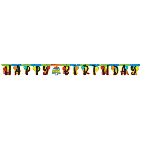 Use this Rainbow Cake Party Banner when planning your party. This jointed banner has a green and blue top border and "Happy Birthday" in black with rainbow backgrounds on each letter. In the middle, there is a cutout of a colorful birthday cake. Sold in quantities of 12, these banners measure 7" x 10' and can be coordinated with any of our other Rainbow Cake party supplies.