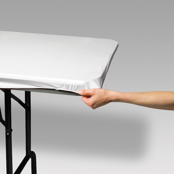 This White Stay Put Table Cover will provide an eye-catching setting at your upcoming event. This plastic table decoration measures 29" x 72” and features elastic around it's edges to keep it held firmly in place. The crisp tablecloth will keep permanent stains away and is ideal for children's' birthday parties, banquets, receptions, or any celebration. Sold in packs of 12.