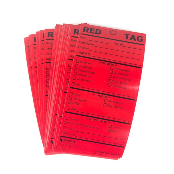 5S Adhesive Red Tags make attaching tags to items quick and easy. They're especially useful for objects that don't have a good tie-point for conventional tags. Red tags are a standardized tool to label equipment for scrapping, moving, and recycling. They feature a high-tack adhesive along the top side of the label for proper tagging in most 5S, healthcare, and manufacturing environments. The bright red color makes them easily visible, allowing items to be quickly identified as tagged items even at a distance. Noticeability helps ensure that the desired action is taken quickly.