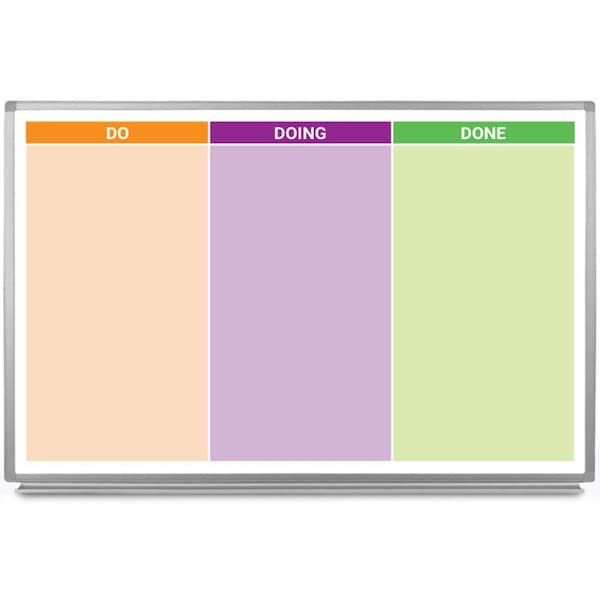 Keep track of necessary task information with the Do - Doing - Done Dry-Erase Whiteboard. This whiteboard is large enough to capture a wide range of info without running out of space and encourages collaboration and communication between departments. The surface of the board is covered with a printed vinyl decal which still allows for writing and clean dry-erasing like any other whiteboard. Our whiteboards are also magnetized, allowing you to use magnetic holders, labels, clips, and more!