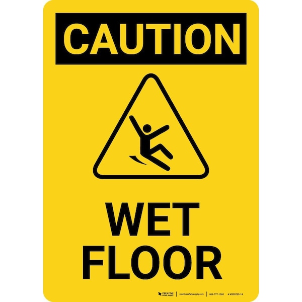 This Caution: Wet Floor with Icon Portrait - Wall Sign is constructed using durable, industrial-grade materials, and is designed to be easily noticeable from a distance. Our wall signs such as this one, can be mounted anywhere necessary, such as doors, sign posts, windows and more!