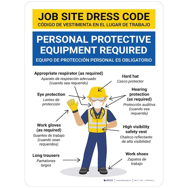 This Job Site Dress Code Personal Protection Required Spanish Bilingual Wall Sign is constructed using durable, industrial-grade materials, and is designed to be easily noticeable from a distance. Our wall signs such as this one, can be mounted anywhere necessary, such as doors, sign posts, windows and more! Mounted To PVC Signboard.