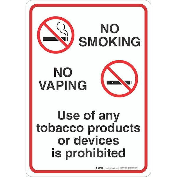 Most companies prohibit the use of smoking on or around their their property, whether its smoking indoors or near building entrances. A No Smoking/No Vaping sign can clearly create the awareness of the restriction your company holds, and lets smokers know that No Smoking also includes electronic cigarettes such as vaping devices. Display this durable sign to let visitors and employees aware that all types of tobacco products or devices are prohibited on company property.