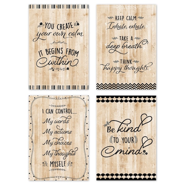 Tips for remaining calm in stressful situations are featured on the charming posters in our Black, White, and Wood Inspire U 4-Poster Pack. Each poster features a helpful reminder with messages ideal for children and adults alike. These posters feature style with black and white core patterns on a neutral wood background are perfect for display in a school, at home or anywhere a little inspiration is needed. Each poster measures 13-3/8" x 19". Pack includes these 4 posters: 10961 You create your own calm..., 10962 Keep calm..., 10963 I can control..., and 10964 Be kind to your mind.