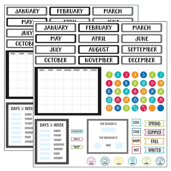 Each 67-piece classroom calendar set includes a calendar chart, 12 month headlines, 33 pre-numbered calendar days, 2 blank calendar days, a days-of-the-week chart, a seasons and weather chart, and coordinating labels. Sold as a pack of 2 complete sets.