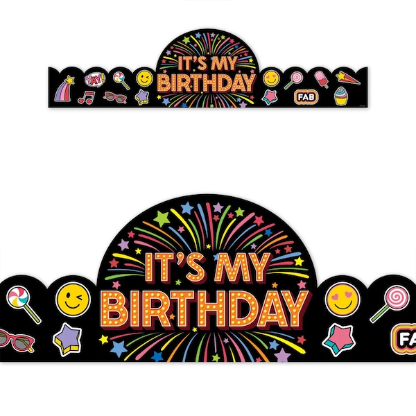 - FUN, COLORFUL DESIGN – These crowns feature the message "It's My Birthday" in marquee lights on a background of colorful exploding stars. Crowns also include fun emoji images.
