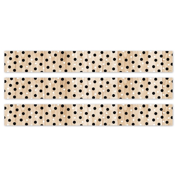 - STYLISH DESIGN – This border features black and white polka dots on a wood-patterned background that will add a touch of style to any bulletin board display.