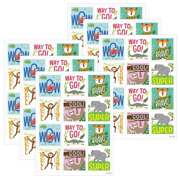 Reward students with these Jungle Friends Rewards Stickers. Inspirational sayings, such as "Well Done," "Way to Go!," and "Bravo," are paired with friendly jungle animals to create motivating reward stickers that will make students feel proud of their efforts. Coordinates with Jungle Friends products. Measures approximately 1-1/2" x 1-1/2". Each pack includes 60 stickers. Sold as 6 packs for a total of 360-stickers.