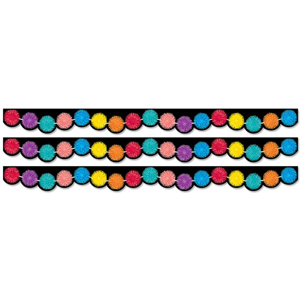 This Pom Poms EZ Border features a rainbow of colorful pom-poms pink, orange, red, turquoise, yellow, blue, and purple on a black background. The bright colors and festive design will be a fun trim on any bulletin board or classroom display. These new EZ borders come in smaller strips, which are easier to manage and store. Each package comes with enough borders to complete 2 full bulletin boards. Each pack includes 24 strips measuring 2-3/4'' x 24'' for a total of 48 feet per package. Sold as 3 packs for a total of 72 strips 144 feet.