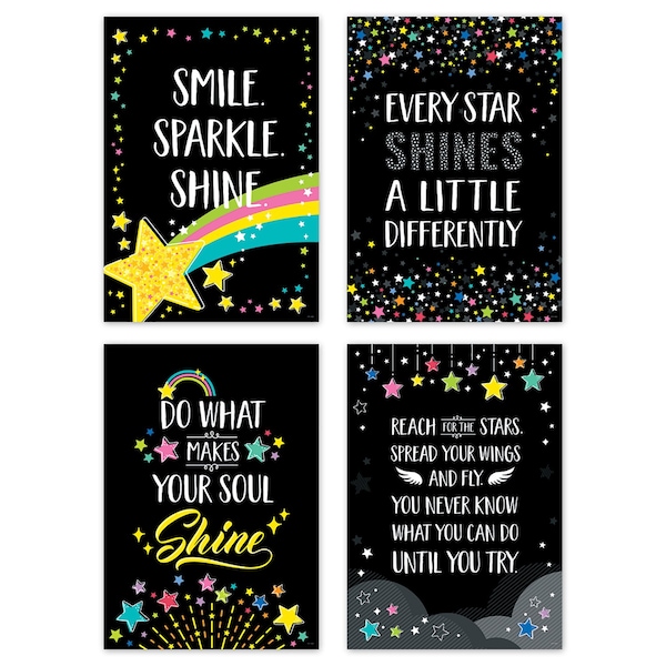 Encouraging advice to help individuals become the best versions of themselves is featured on the star-studded posters in this Star Bright Inspire U 4-Poster Pack. The posters' colorful stars on a black background make for a dazzling look that will add vitality and glamour to any room. Perfect for display in a school, at home or anywhere a little inspiration is needed. Each poster measures 13-3/8" x 19". Pack includes these 4 posters: 10957 Smile. Sparkle. Shine., 10958 Every star shines..., 10959 Do what makes your soul shine., and 10960 Reach for the stars...
