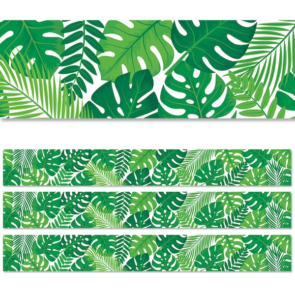 This Palm Paradise Tropical Leaves Border features a mix of lush green monstera and palm leaves. These vibrant leaves will complement a wide variety of bulletin board displays and classroom decoration themes, including those related to science, plants, nature, jungle and zoo. Use this border to trim an inspirational "Unbe-leaf-able Work" or "Be-leaf in yourself" bulletin board. These EZ borders come in smaller strips, which are easier to manage and store. Each pack comes with enough borders to complete 2 full bulletin boards. Strips measure 3" x 24". Each pack includes 24 strips (48 feet). Sold as 3 packs for a total of 72 strips (144 feet).
