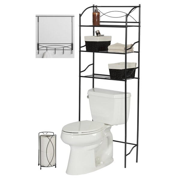 3 piece bath collection set containing the most wanted pieces for the bath. 3 Shelf SpaceSaver, 5 Hooks Over the Door Rack and 2 Roll Toiilet Tissue Holder. Display, organize and store in style. All steel construction with durable powder coat finish. Easy asembly, all tools included. Wipe clean with soft damp cloth. 3 Shelf Space Saver 23.6W x 9.9D x 64.8H. 5 Hooks Over the Door Rack 15.7 x 4.5 x 16.5"H. 2 Roll Toilet Tissue Reserve 6.5 x 6.5 x 11