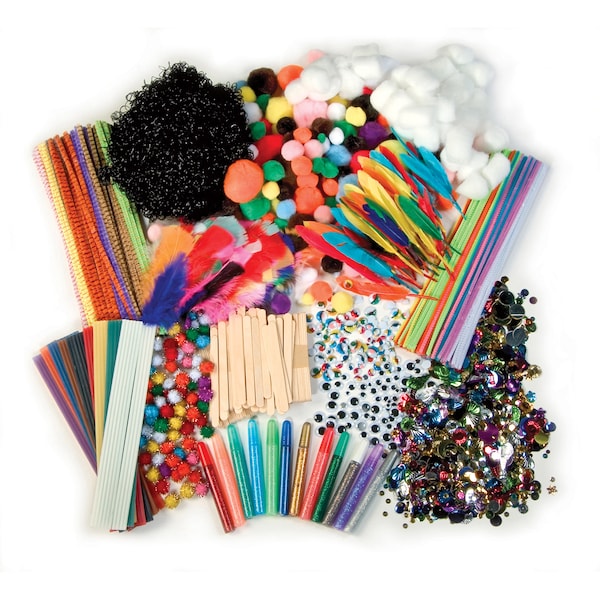 This activity box features an extensive assortment of craft products for loads of creativity and fun. Wax Works sticks easily bend into any shape you like. Wiggle eyes move and shake to bring your creations to life. Glitter glue pens dispense nontoxic glue with sparkling accents to create the dazzling effect of glitter without any of the mess. Wooden craft sticks are great for stirring inks and paints, or decorate them to become a part of your creation. Also included are several other craft items for embellish your creations, including chenille stems, pom pons, craft hair, fluffs, feathers and more.