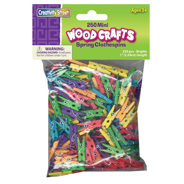 Mini Clothespins have many arts and crafts applications. They can also be used to hang student artwork around the classroom or home. Perfect for all types of craft projects or activities. These clothespins in bright hues assortment measure 1" in length. Each pack includes 250 clothespins.