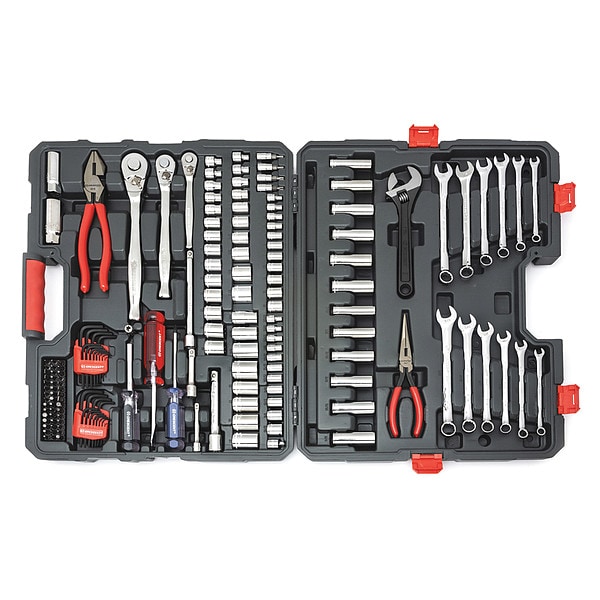Mechanics Tool Set,170 pc., Measurement Type Metric/SAE, Drive Size 1/4 in; 3/8 in; 1/2 in, Number of Pieces 170, Pliers Included Long-Nose, Tongue and Groove Pliers, Sockets, Drive Tools, and Accessories Included None, Wrenches Included Adjustable Wrenches, Combination Wrenches, Cutting Tools Included None, Plumbing Tools Included None, Electrical and Telecom Tools Included None, Measuring and Testing Tools Included None, Miscellaneous Tools Included Spark Plug Sockets, Number of Pliers 2