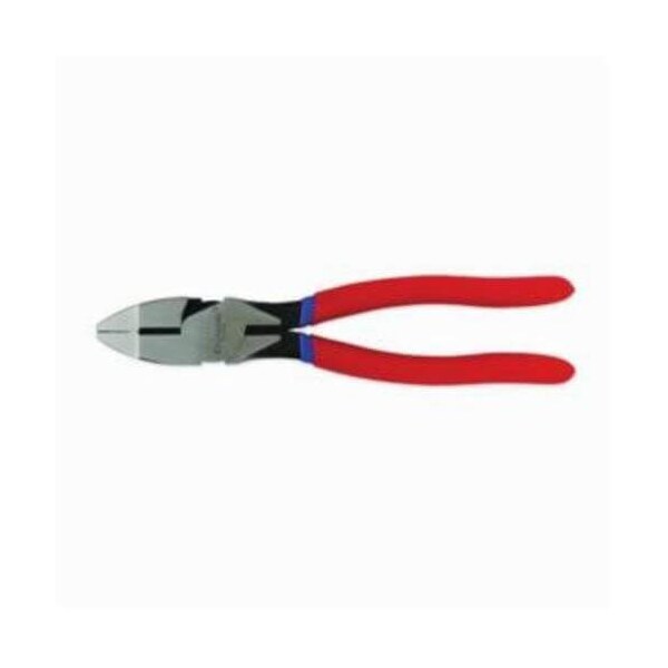 Crescent lineman's diagonal cutting plier high leverage solid joint, straight jaw, 1-9/16 in L x 1-9/32 in W x 5/8 in thick jaw, forged alloy steel jaw, 11 AWG for maximum wire thickness, standard/side cut style, 9-1/4 in OAL, double dipped/cushion grip handle, blue/red.