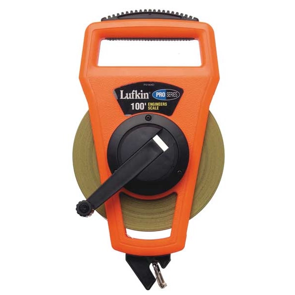 Long Tape Measure, Features 3:1 Rewind, Case Material ABS Plastic with Rubber Grip, System of Measurement SAE/Engineers Scale, Graduation Marks 1/100 in, Tip Style Nonmagnetic Single Hook, Zero Point Location Hook End, Blade Length - Metric Not Applicable, Blade Length - SAE 100 ft, Blade Material Steel, Blade Width 1/2 in, Blade Return Type Manual, Blade Type Single-Sided, Case Color Black, Orange, Case Length 13 1/8 in, Lock Type Nonlocking, Graduation Units Feet, Numeric Marks Feet, Inches
