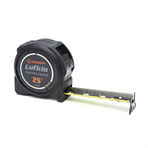 Lufkin tape measure black clad, series: command control, measuring system: imperial, 25 ft blade L, 1-3/16 in blade W, 11 ft standout, finger tip rewind, button locking, 360 Deg end hook, ergonomic case.