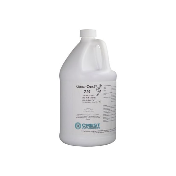700715c chem-crest 715 mild liquid detergent is useful in many applications requiring good detergency and wetting, especially on hard surfaces. It is a nonetching and neutral ph detergent. It can also be used as an additive to other detergents to increase wetting capability. substrate compatibility: chem-crest 715 is safe on copper, beryllium, copper alloys, brass, gold, silver, stainless steel, aluminum, plastics, glass, nickel alloys and ceramics when used as directed. operating conditions: chem-crest 715 is used at 3-10% by volume in ultrasonic cleaning applications for light to heavy contaminants. Normal operating temperatures: 130-160f. Recommended rinsing water temperature: 110 - 150f. typical contaminants removed: chem-crest 715 removes oils, lubricants, particles, fingerprints, light silicone oils, mold release compounds, buffing compounds and airborne contaminants. availability: chem-crest 715 is available in cases of 4 x 1-gallon plastic bottles, 5-gallon pails, and in 55 gallon containers.
