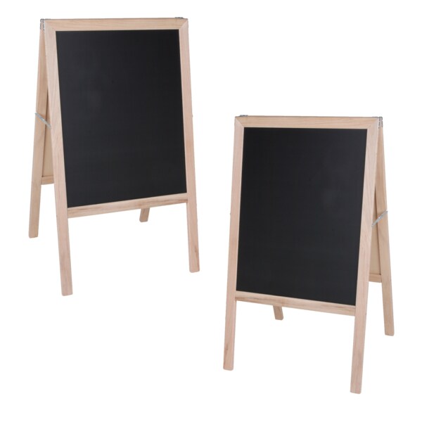 Signage easels are ideal for announcements, sales, specials, menus, and much more! Easels fold flat for easy storage.This natural wood easel features a black chalkboard on each side. 42" T x 24" W
