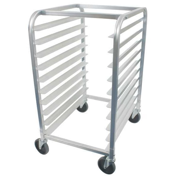 Pan Rack, Nesting No, Load Capacity 250 lb, Overall Height 38 in, Brake Yes, Overall Width 20 in, Product Type Pan Rack, Caster Type (4) Swivel Caster with Brake, Color Silver, Depth 26 in, Distance Between Shelves 3 in, Number of Slots 10, Includes Top No, Material Aluminum, Compatible Sheet Pan Size Full Size, Compatible Pan/Tray Dimensions 18 x 26 in, NSF Certified No, Size Half Size