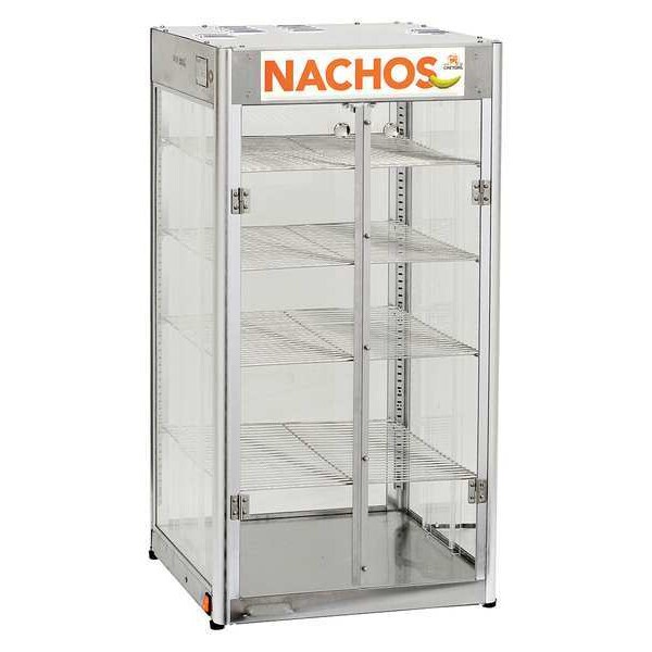 Heated Display Case, Number of Shelves 6, Holds 10 lb, Overall Height 36 1/4 in, Overall Width 18 1/2 in, Overall Depth 19 in, Color Silver, Current 4.6 A, Voltage 120V AC, Wattage 550 W, For Use With Nacho Chips, Features Lift-off Vyvak Doors, Cornditioner System, Internal Lights, Material Acrylic, Stainless Steel, Maximum Operating Temperature 100 Degrees F, Plug Type 5-15, Power Source Electric, Standards UL/ULS Listed