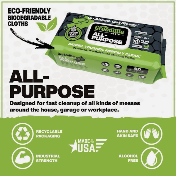 Convenient biodegradable cleaning cloths make fast work of all kinds of messes around the house garage or workplace. They remove grease grime and dust from all surfaces including counters floors carpets upholstery appliances cabinets and more. Pre-moistened wipes stay moist longer and features a super tough heavy-duty build.