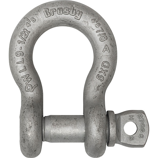 Anchor Shackle, Shackle Type Anchor Shackle, Lifting Capability For Lifting, Working Load Limit 36,000 lb, Width Between Eyes 2 1/32 in, Body Material Alloy Steel, Inside Length 4 11/16 in, Inside Width 3 1/4 in, Body Thickness 1 1/4 in, Body Color Silver, Body Finish Galvanized, Pin Type Removable Screw Pin, Pin Diameter 1 3/8 in, Pin Material Alloy Steel, Pin Color Silver, Pin Finish Galvanized, Minimum Operating Temperature -40 Degrees F, Maximum Operating Temperature 400 Degrees F