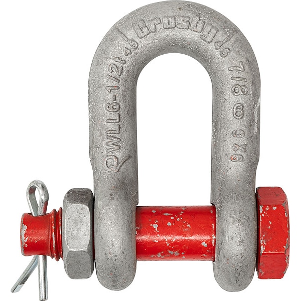 D-Shackle, Shackle Type Chain Shackle, Lifting Capability For Lifting, Working Load Limit 3,000 lb, Width Between Eyes 3/4 in, Body Material Carbon Steel, Inside Length 1 1/2 in, Inside Width 3/4 in, Body Thickness 7/16 in, Body Color Silver, Body Finish Galvanized, Pin Type Removable Bolt and Nut, Pin Diameter 1/2 in, Pin Material Alloy Steel, Pin Color Red, Pin Finish Galvanized, Minimum Operating Temperature -40 Degrees F, Maximum Operating Temperature 400 Degrees F