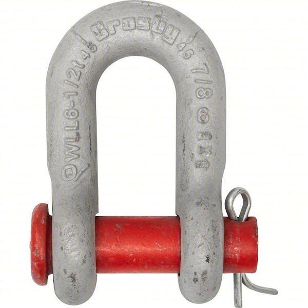 D-Shackle, Shackle Type Chain Shackle, Lifting Capability For Lifting, Working Load Limit 9,500 lb, Width Between Eyes 1 1/4 in, Body Material Carbon Steel, Inside Length 2 3/8 in, Inside Width 1 1/4 in, Body Thickness 3/4 in, Body Color Silver, Body Finish Galvanized, Pin Type Removable Round Pin, Pin Diameter 7/8 in, Pin Material Alloy Steel, Pin Color Red, Pin Finish Galvanized, Minimum Operating Temperature -4 Degrees F, Maximum Operating Temperature 392 Degrees F