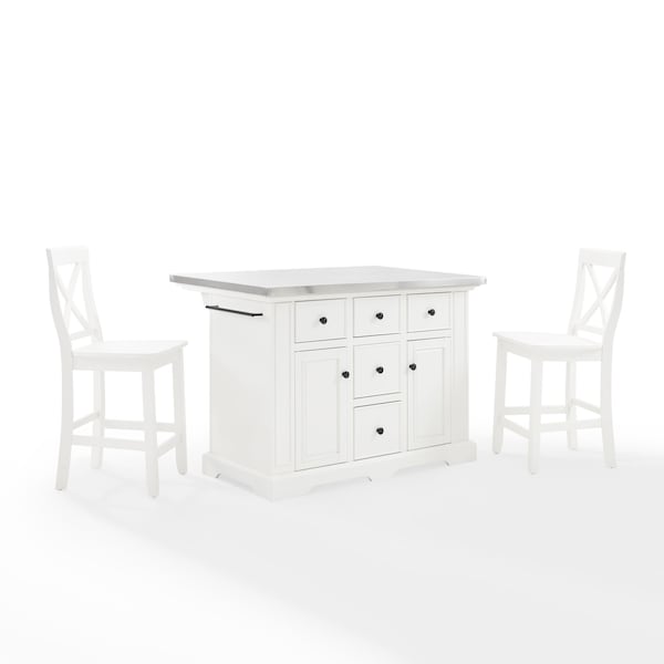 Julia Stainless Steel Top Island with Storage, Coffee Bar, and a Set of 2 X-Back Stools