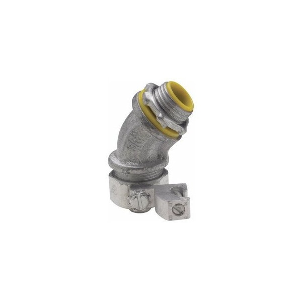 3/4'', Zinc Electroplated Malleable Iron, Insulated Throat, 45D, Liquidtight Flexible Conduit Connector with Aluminum Grounding Lug