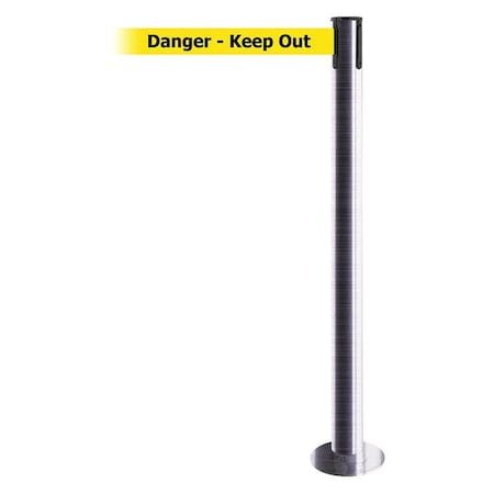 Barrier Post with Belt, 7 1/2 ft Length, 36 1/2 in Post Height, Danger Keep Out, Satin Chrome