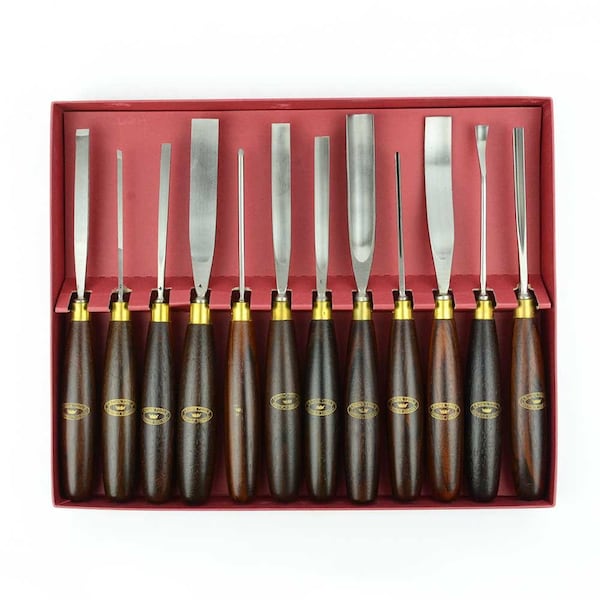 Crown Tools 2241 12 Pieces Woodcarving Set Set - Cardboard Box. Our woodcarving tools are hot forged from the finest carbon steel, hardened & tempered to achieve a Rockwell hardness of 57/60. The blades are traditionally ground, fitted with brass ferruled rosewood handles & honed ready for use.