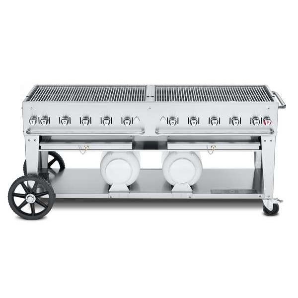 Gas Grill, Heat Source Propane, Overall Height 36 in, Overall Depth 28 in, Overall Length 81 in, Number of Burners 10, Cooking Surface Depth 21 in, Cooking Surface Width 70 in, Heating Capacity 159,000 BtuH, Tank Capacity (2) 30 lb Tanks, Material Stainless Steel, Caster Diameter 5 in, Caster Type (2) Total Lock Swivel Casters, Weight 334 lb, Wheel Size 14 in, Wheel Type ABS Plastic