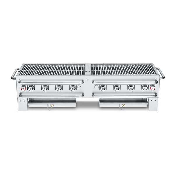 Portable Gas Grill, Heat Source Propane, Overall Height 15 3/4 in, Overall Depth 26 1/2 in, Overall Length 66 1/2 in, Number of Burners 8, Cooking Surface Depth 21 in, Cooking Surface Width 58 in, Heating Capacity 129,000 BtuH, Tank Capacity (2) 20 lb Tanks, Material Stainless Steel, Mount Type Portable, Includes 10 ft Gas Hose, Weight 171 lb
