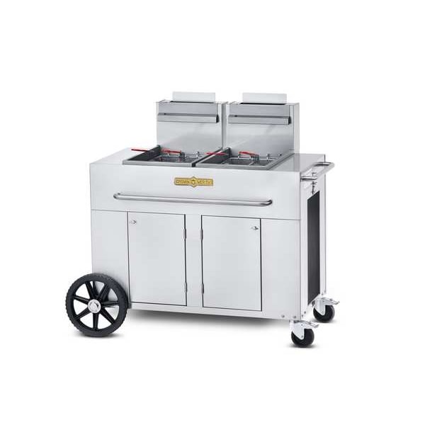 Portable Fryer, Capacity 40 lb, Number of Fry Pots 2, Overall Height 48 3/4 in, Overall Width 38 in, Overall Depth 30 1/2 in, Material Stainless Steel, Heating Capacity 180,000 BtuH, Maximum Operating Temperature 400 Degrees F, Tank Capacity (2) 30 lb Tanks, Caster Diameter 5 in, Caster Type (2) Total Lock, Drain Type 1 1/4 in Full Port Ball Valve, Includes (4) Fry Baskets, Drain Valve with Drain Pipe Extension, Tank Cover, Minimum Operating Temperature 200 Degrees F, Power Source Propane